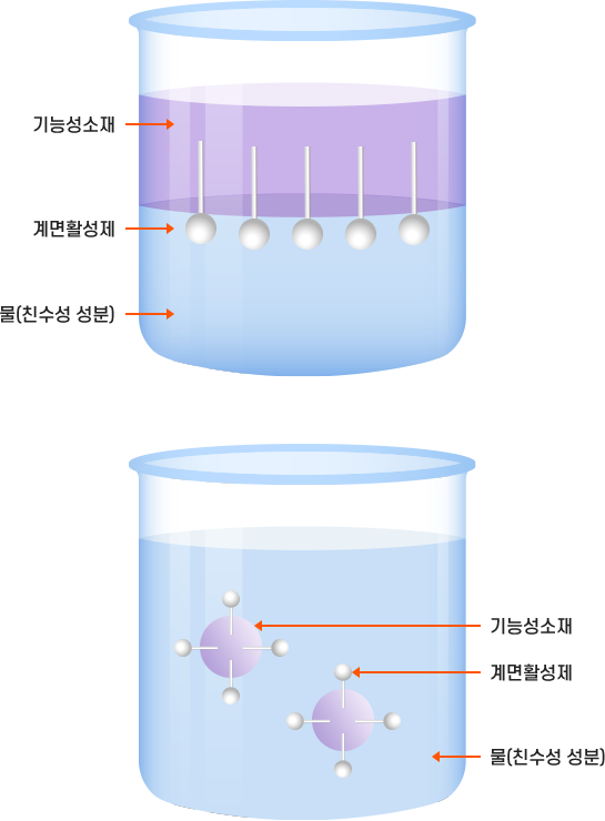 유화, 가용화 기술을 이용하여 물에 녹지 않은 지용성 및 난용성 성분들을 식품용 계면활성제를